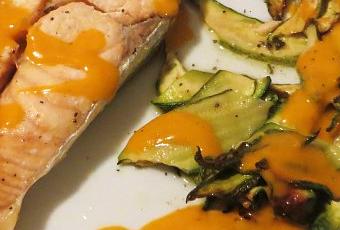 Servire il salmone nei piatti con le zucchine e guarnire a piacere con l’emulsione di pomodorini.