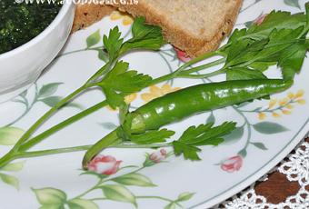 Tritare finemente con una mezza luna, oppure nel mixer se preferite, l’aglio, il peperoncino verde, il prezzemolo, l’aceto, il pepe, l ‘olio ed infine il sale. Abbiate l’accortezza di assaggiare il preparato perchè sia sufficientemente saporito. ATTENZIONE E’ MOLTO PICCANTE