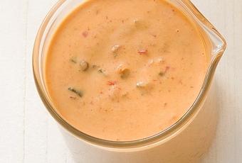 Si riuniscono nel vaso del frullatore 100 gr di maionese, 30 gr di ketchup, 1 uovo sodo affettato, 2 cetriolini in agrodolce a cubetti, 1 falda di peperone rosso, 1 cucchiaino di cipolla e 1 ciuffo di prezzemolo tritati, il succo di 1/2 limone, 1 cucchiaino di miele, una presa di sale e 1 pizzico di pepe di Cajenna.