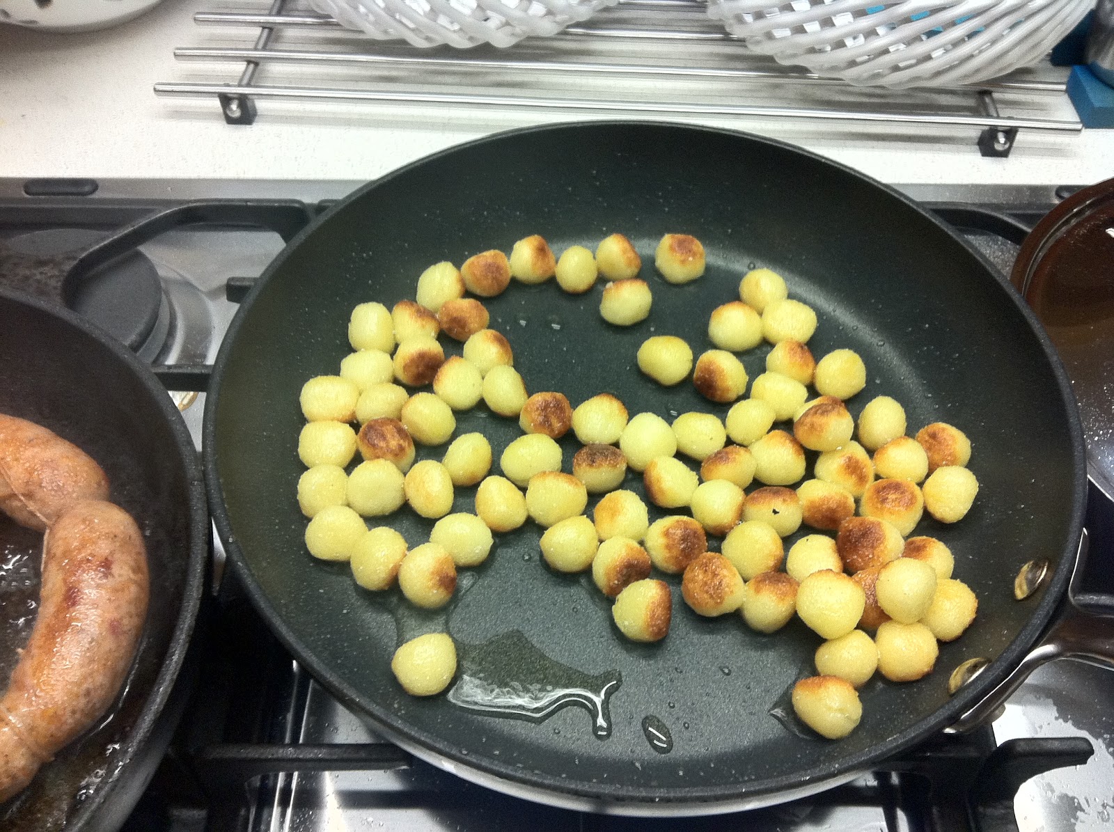 Proseguire la cottura degli gnocchi, fino a che diventino dorati. Salarli leggermente.