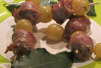 ingredienti per 2 persone 4 salsicce uva bianca foglie di alloro (del mio albero!) *bistecchiera Brilla IPAC Ho tagliato le salsicce a pezzetti, ho punzecchiate con una forchetta per evitare che la pelle si rompa durante la cottura e fuoriescano e le ho messe nella bistecchiera antiaderente, ho aggiunto delle foglie di alloro a pezzettini, ho cotto a fuoco basso per 15 minuti, mescolando. Ho lavato dell'uva bianca, tolto i semini all'interno, e una volta che i pezzi di salsiccia sono ben rosolati ho unito gli acini e cotto ancora per altri 15 minuti e servito infilzato negli spiedini. Ho abbinato un rosè Burlesque RACEMI
