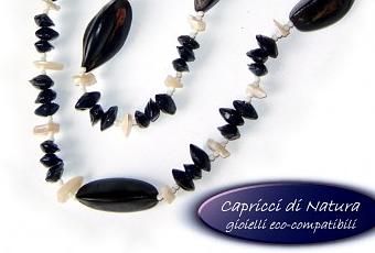 Ad autunno iniziato, i colori più scuri si fanno strada…non so perché! Forse perché li vedo più in armonia con i tessuti ed i colori che andremo ad usare giornalmente. Oggi vi propondo Samadi, un bellissimo modello composto da mandorle americane e noccioli di ciliegia. Molte sono state le versioni proposte, in verde, blu, con ametista, cristallo…. Per chi volesse dare un’occhiata può cliccare qui . Questa nuova proposta vede cristallo bianco e madreperla australiana, bianca con venature rosa. Molto preziosa e di gran contrasto con le tonalità del blu scuro e del prugna che caratterizzano questa collana. E’ lunga circa 100 cm e non ha ganci di chiusura.