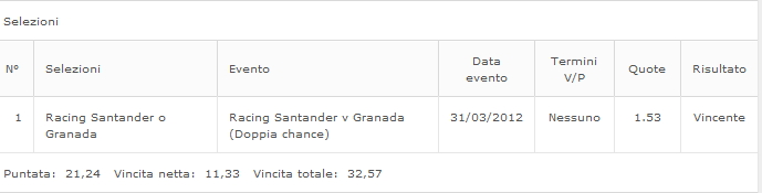Nel pomeriggio ho bancato il pareggio di Racing Santander - Granada alla fine del primo tempo, le squadre erano ferme sullo 0-0. Il match, per mia fortuna, si sblocca solo al 90' su calcio di rigore (vittoria Granada).