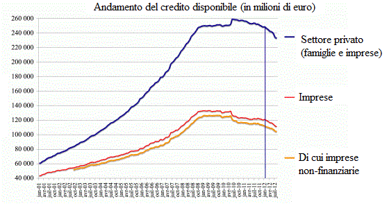 - (iii) Il rischio bancario elevato in Grecia, Spagna e Portogallo, spiega infine la riluttanza delle banche ad assumersi rischi aggiuntivi. In Spagna, dove si stima che le sofferenze (crediti deteriorati o inesigibili) raggiungano i 180 miliardi di euro (agosto 2012) ossia il 10,5% del patrimonio delle banche [15], questa reazione ha causato un forte calo dell'attività di credito bancario interno. In Grecia, le stesse ragioni si sono combinate con i due fattori sopra citati per arrivare ad un arresto totale delle operazioni di credito. In Portogallo, il fenomeno tende attualmente al livello osservato in Spagna.