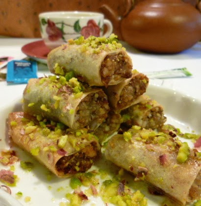 Ingredienti:- 4 fogli di pasta fillo imburrati con burro fuso- 1 ½ tazze da thè di noci e mandorle sgusciate e pestate nel mortaio- 4 cucchiai di pangrattato- cannella e chiodi di garofano in polvere- 3 cucchiai colmi di zucchero semolato- 1 tazzina da caffè di burro fuso- pistacchi tritatiPer lo sciroppo:- 1 tazza da thè di zucchero semolato- ½ tazza da thè di acqua- qualche goccia di limoneProcedimento:Scongelare la pasta e separare 4 fogli. Prendere due e sovrapporre l’uno sull’altro. Fare lo stesso con gli altri due. Mescolare la frutta secca, il pangrattato, le spezie e lo zucchero semolato e distribuire il ripieno sui fogli sistemandolo per la lunghezza e vicino a una delle estremità formando una sorta di salsicciotto, lasciando 1 cm. di spazio ai lati. Piegare i lati sul ripieno e arrotolare stretto. Spennellare del burro sul punto di chiusura per sigillare la pasta, tagliare con un coltello affilato a pezzi di circa 5 cm. e sistemarli su una teglia imburrata. Spennellare con del burro fuso e infornare per 15 minuti a 180 gradi.Preparare lo sciroppo mettendo a bollire tutti gli ingredienti per 6 – 7 minuti. Togliere la teglia dal forno e versare lo sciroppo caldo. Lasciare che assorba. Spargere sopra dei pistacchi tritati.