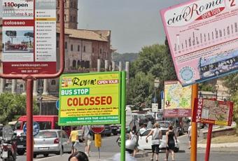 Fa un certo piacere tornare a Roma, leggere la rassegna stampa linkata dai collaboratori del blog e scoprire una montagna di articoli dedicati al degrado. In particolare, ci piacciono gli articoli (1 e 2) pubblicati da Repubblica (con tanto di foto) sulla Cartellopoli romana. Uno scandalo senza fine che ha subito, negli ultimi tempi, un ulteriore salto di qualità, caratterizzandosi ormai come "palopoli". C'è da segnalare infatti l'invasione delle paline dei bus turistici, l'ultima oscenità partorita dalla città più incivile, cafona e peracottara del mondo. Una zingarata di proporzioni cosmiche. Una selva di pali e paletti che impediscono di godere delle bellezze della città, attanagliando addirittura il Colosseo, il monumento più visitato d'Italia, una delle sette nuove meraviglie del mondo. Nuovi pali, paletti, paloni, cartellini, cartelloni, cartellonazzi, continuano a spuntare come funghi. Per non parlare delle affissioni selvatiche, pratica barbara e primitiva che ha trovato nuova linfa grazie alla presenza di nuovi pali freschi pronti per l'uso. La "palopoli" romana non accenna a fermarsi. E attenzione, perchè la legge del contrappasso potrebbe avere, per i colpevoli di questo scempio inaudito, risvolti poco piacevoli. Ma nulla frena i peracottari romani, che quando sentono odore di affare sono disposti a devastare tutto senza farsi troppi problemi. Purtroppo per loro, i nuovi barbari hanno fatto i conti senza l'oste. Il centro storico di Roma è stato inserito da tempo nelle liste dell'UNESCO, tutelato come patrimonio dell'Umanità. Questo significa che tutelare il centro dalla invasione dei barbari bavosi è un preciso dovere di amministrazione e cittadini. Stiamo dunque preparando un bel dossier professionale da inviare all'UNESCO, documentando e mostrando tutti gli scempi compiuti negli ultimi anni a Roma. Ce n'è abbastanza per chiedere la rimozione di Roma dalle liste dell'UNESCO. Sarebbe, per Roma, una catastrofe di proporzioni cosmiche e un danno di immagine incalcolabile.
