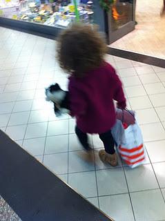 Alla fine della seduta di shopping, la Ciccia, che è già più femminile di Sua madre, se ne va in giro con animale di peluche sotto un braccio e busta con gli acquisti nell'altra mano.