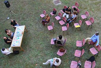 Il cortile dei loggiati di San Domenico, che stanno tornando pian piano ad essere il centro pulsante della città, è il luogo dove, nel tardo pomeriggio, avvengono le presentazioni e gli incontri con gli autori.
