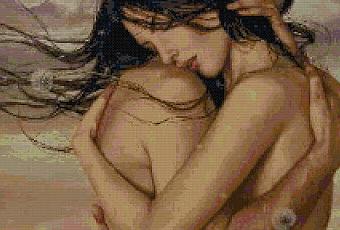 Schema da realizzare a punto croce con l'immagine di due innamorati. L'immagine mostra l'anteprima del lavoro terminato