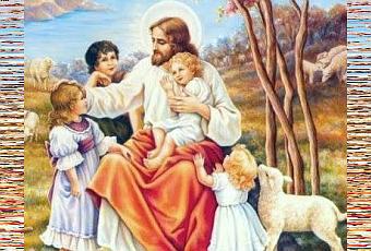 Schema da realizzare a punto croce con l'immagine di Gesù tra i fanciulli. L'immagine mostra l'anteprima del quadro completato a punto croce.