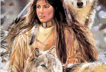 Schema da realizzare a punto croce con una bellissima indiana seduta tra i lupi