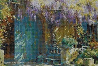 Schema a punto croce con l'immagine di un quadro realizzato dal pittore Johan Messely della serie " Il giardino segreto". L'immagine mostra l'anteprima del lavoro terminatoI punti dello schema: 400 x 397