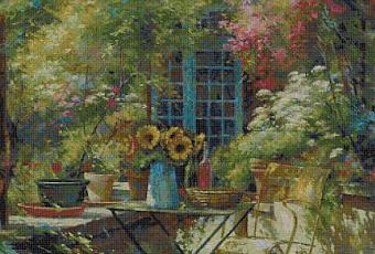 Schema a punto croce con l'immagine di un quadro realizzato dal pittore Johan Messely della serie " Il giardino segreto". L'immagine mostra l'anteprima del lavoro terminato