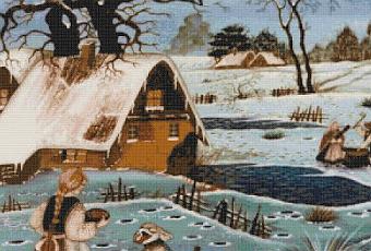 Schema da realizzare a punto croce con paesaggio invernale. L'immagine mostra l'anteprima del quadro completato a punto croce.