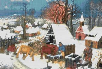Schema da realizzare a punto croce con paesaggio invernale. L'immagine mostra l'anteprima del quadro completato a punto croce.