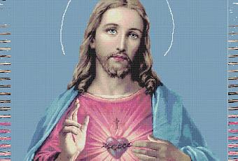 Schema da realizzare a punto croce con l'immagine del Sacro Cuore di Gesù. L'immagine mostra l'anteprima del quadro completato a punto croce.