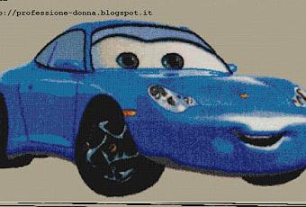 Tappeto da realizzare a punto croce con una macchina blu dagli occhi grandi . L'immagine mostra l'anteprima del lavoro terminato. (Si può utilizzare lo schema anche per realizzare un quadro o un pannello)