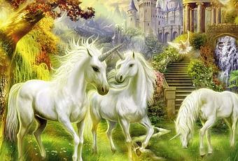 Pesaggio mitologico con unicorni da realizzare a punto croce.