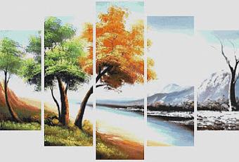 Schema a punto croce di un bellissimo trittico con raffigurato l'albero delle 4 stagioni. L'immagine mostra l'anteprima del lavoro terminatoI punti dello schema: 500 x 290