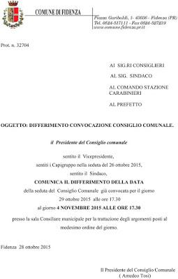 Per ragioni indipendenti dalla mia e dalla vostra volontà il preannunciato Consiglio Comunale del 29 ottobre 2015 è stato rinviato al 4 novembre alle ore 17.30 con lo stesso ordine del giorno.