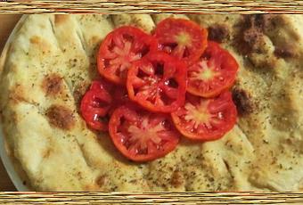 Sigillare la schiacciata con le punte delle dita, spennellarla con olio, profumare con ancora un pò di origano e praticare dei tagli trasversali con un coltello sulla superficie, per permettere al vapore di uscire in cottura.
