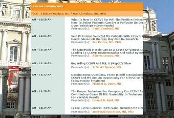 La PTA venosa aiuta i pazienti SM con CCSVI selezionati: non ci sono dubbi: la terapia con cellule staminali può anche essere utile Slides disponibili http://www.veithsymposium.org/abstracts/2014/vei/237.pdf Il muscolo omoioideo può essere una causa di compressione venosa che conduce alla CCSVI: Documentazione e Rilievo con resezione Slides disponibili http://www.veithsymposium.org/abstracts/2014/vei/238.pdf Per quanto riguarda CCSVI e SM, Una visione scettica Slides disponibili http://www.veithsymposium.org/abstracts/2014/vei/240.pdf Aggiornamento sullo studio di angioplastica venosa con palloncino vs la venografia placebo: cosa ci dice Slides disponibili http://www.veithsymposium.org/abstracts/2014/vei/245.pdfDr. Albert Lomeo -