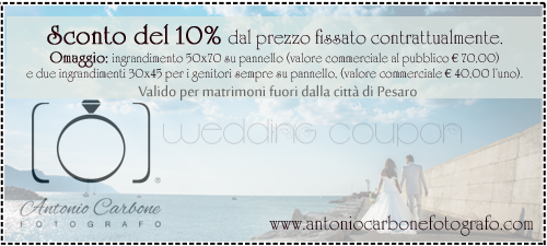Agli Sposi che prenotaneranno un servizio fotografico firmato Antonio Carbone, utilizzando il Wedding Coupon all'interno di questo post, per servizi che si svolgeranno fuori dal territorio pesarese, il fotografo offre uno sconto pari al 10% dal prezzo fissato contrattualmente, oltre ai consueti omaggi per tutti gli Sposi, ovvero un ingrandimento 50x70 su pannello (valore commerciale al pubblico € 70,00) e due ingrandimenti 30x45 per i genitori sempre su pannello, (valore commerciale € 40,00 l’uno).