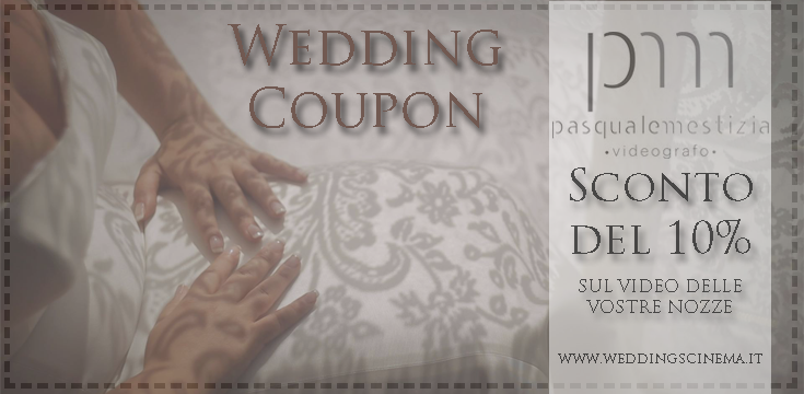 Il video delle vostre nozze diventa un Film grazie al videografo Pasquale Mestizia, che offre a tutti i lettori del nostro blog un imperdibile Sconto del 10% sui suoi servizi.Per accedere allo sconto vi basterà utilizzare il Wedding Coupon che troverete qui sotto.