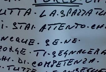 Pubblico oggi la foto inviata da un seguace del blog, il nostro caro amico Pisa; la scritta comica in questione dovrebbe essere un avviso a non buttare spazzatura, cosa con cui mi trovo pienamente d’accordo, il problema, a limite, può essere la considerazione che gli sarà data visti gli orrori grammaticali presenti, comunque, a voi la foto.