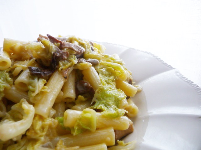 Ungere un tegame con 2 cucchiai di olio e far imbiondire 1 spicchio d'aglio, unire i funghi, farli insaporire per 5-6 minuti e tenerli da parte; fare imbiondire l'altro spicchio d'aglio nell'olio rimasto, poi aggiungere la verza e i funghi.