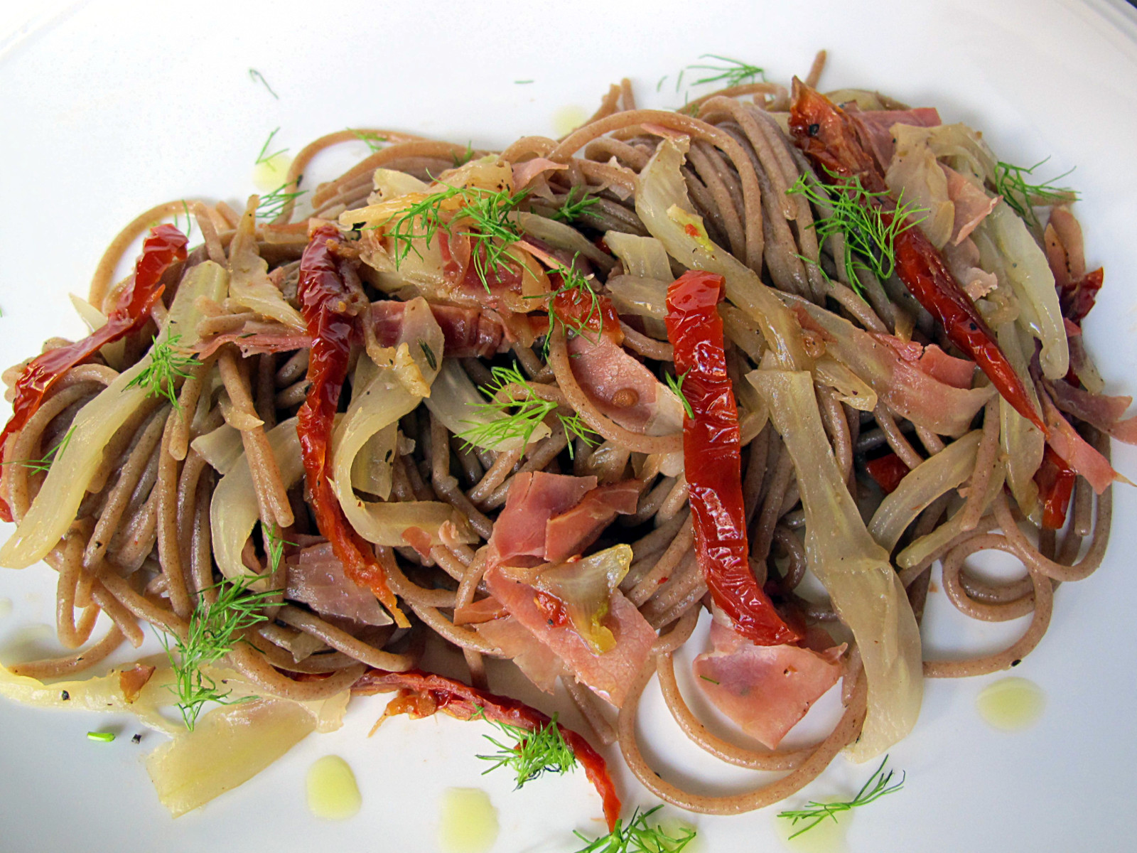 Mondare e lavare i finocchi, tagliarli in quarti ed affettarli finemente con la mandolina,Soffriggere dolcemente lo scalogno tritato nell'olio e due cucchiai di acqua, quando comincia a colorire e l'acqua è tutta evaporata aggiungere lo speck tagliato a striscioline quindi sfumare con uno spruzzo di vino bianco non appena il grasso diventa trasparente. Unirvi i finocchi e farli insaporire per qualche minuto finché diventano abbastanza coloriti restando però ancora croccanti e regolare di sale e pepe. Aggiungere quasi a fine cottura pomodori secchi ammollati, tagliati a striscioline e cuocere finché la verdura risulti morbida.Cuocere i Segalin in abbondante acqua salata per 5 minuti, scolarli e ripassarli in padella con il sugo preparato, servire passando a parte parmigiano grattugiato per chi lo volesse.