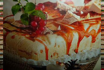 per la salsa versate lo zucchero in un padellino e unite 1 cucchiaio di succo di limone e 4 di acqua poi fate caramellare a fiamma media per 6 minuti fino a che sarà dorato incorporate 1 dl di acqua bollente versandola a filo poi lasciate raffreddare mescolando di tanto in tanto estraete lo stampo dal freezer e sformate il semifreddo sul piatto da portata aiutandovi con la pellicola irroratelo con la salsa al caramello decorate con fiocchetti di panna montata il torrone rimasto spezzettato i rametti di ribes e qualche fogliolina di menta