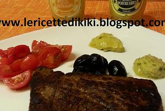 Non vi metterò la ricetta con ingredienti ecc perchè è abbastanza intuitiva :-)Cuocere alla griglia una bella bisteccozza con la cottura che desiderate, al sangue o ben cotta, e servire con pomodorini, olive nere e senape :-DNoi qui abbiamo voluto assaggiare la SENAPE AL DRAGONCELLO e la SENAPE AL PEPE VERDE, entrambe si accompagnano molto bene alla carne, hanno davvero un bel sapore deciso e si distinguono molto bene i sapori dei due aromi. Quella al pepe verde è divina, ma io ho una predilezione per le salse al pepe verde ;-)