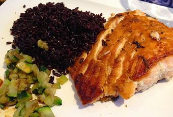 Salmone fresco, o congelato e lasciato scongelare, 200 gr di Riso Venere, Zucchine, sale q. b. (io ho utilizzato il Sale Cristallino Himalayano Fine Integrale Non Raffinato di SorgenteNatura), Shoyu se piace.