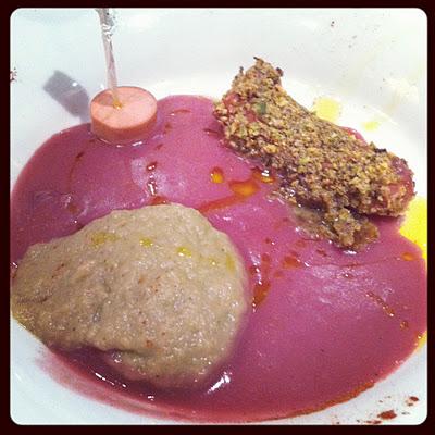 Wurstel in panur di pistacchi con mousse di melanzane e salsa di nero d'avola