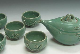 Questo servizio da tè in porcellana celadon, ideale per un regalo prezioso, è composto dalla teiera a forma di pesca, una ciotola da tè e cinque tazze. Tutti i pezzi sono decorati in rilievo con foglie e rami di pesco e smaltati con il tipico smalto della ceramica celadon, dal colore verde giada. Le ceramiche celadon dell'epoca Koryeo sono gli oggetti d'arte coreani più conosciuti al mondo.