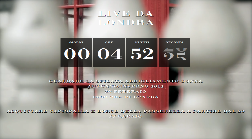 Apriamo la settimana con un invito speciale per tutti voi. Oggi, lunedì 20 febbraio 2012, alle ore 16.00 (orario di Londra), verrà trasmessa in diretta la sfilata Burberry Donna Autunno/Inverno 2012. Immaginatevi seduti nel front-row, pronti a imprimere nella vostra mente ogni dettaglio che vi colpisce. Ma come se non bastasse, al termine dello show, potrete acquistare capispalla e borse dalla passerella.Vi basterà sintonizzarvi qui alle ore 17.00 (orario italiano) e per una manciata di minuti vi sembrerà di essere in terra londinese.Non è un'ottimo modo per affrontare questo grigio lunedì?Che sia uno splendido lunedì.
