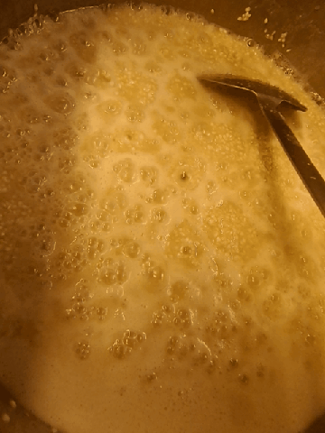 far raffreddare, poi aggiungere le uova, l'uvetta, i gherigli di noci, i pinoli, il burro ammorbidito, il lievito e la buccia di limone grattugiata e amalgamare il tutto.