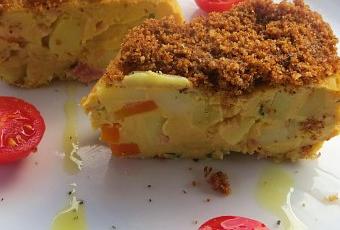 Lasciare riposare lo sformato per 20 minuti, poi capovolgerlo sul piatto da portata e spalmarne la superficie con il pane tostato, premendo leggermente per farlo aderire.