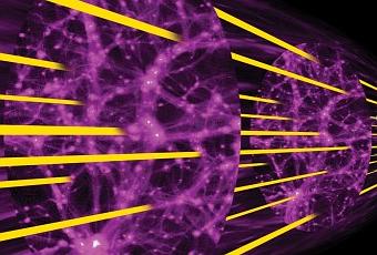 L’espansione dell’Universo è mostrata da destra verso sinistra. Dal momento del Big Bang l’espansione è iniziata velocemente per poi rallentare. In seguito ha subito successive spinte dovute all’energia oscura che ha separato le diverse strutture dell’Universo appena nato (come si vede nelle zone viola dell’illustrazione). La luce ha creato dei quasar (le stelle bianche alla destra dell’immagine) e poi ha attraversato tutto l’Universo in espansione (linee gialle). Gli astronomi hanno misurato l’espansione dell’Universo studiando queste strutture. (Crediti: Paul Hooper http://www.spirit-design.com / con Mat Pieri and Gongbo Zhao, ICG)