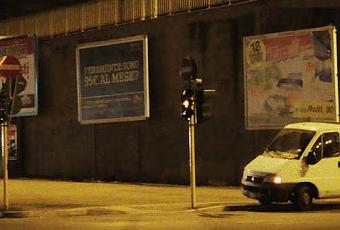 Sulla sinistra, due operai, dotati solo di una scaletta e di una tutina catarifrangente. Nessun casco. Per terra c'è un secchiello bianco pieno di colla, uno scopettone e le strisce di manifesti da attaccare. Sono le due di notte. Chissà perché 'ste cose vanno fatte "de nascosto".