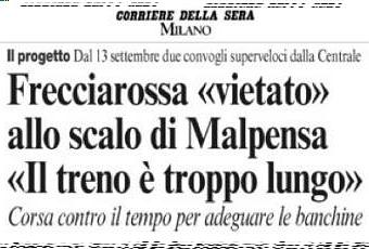 Il Frecciarossa a Malpensa, dal 13 settembre. Grazie al Frecciarossa, Malpensa e Roma, sulla carta, separate da sole 4 ore e 24 minuti.
