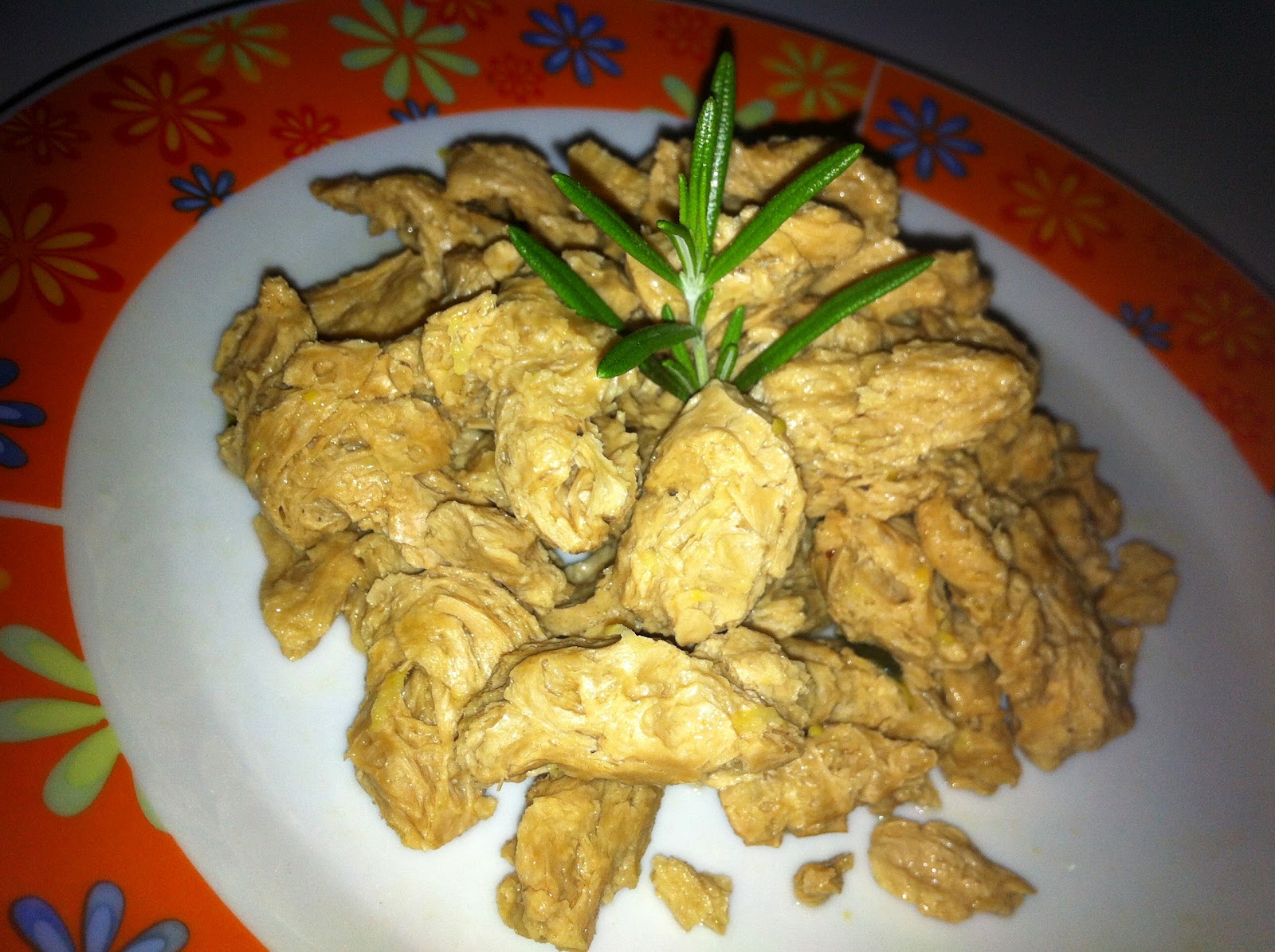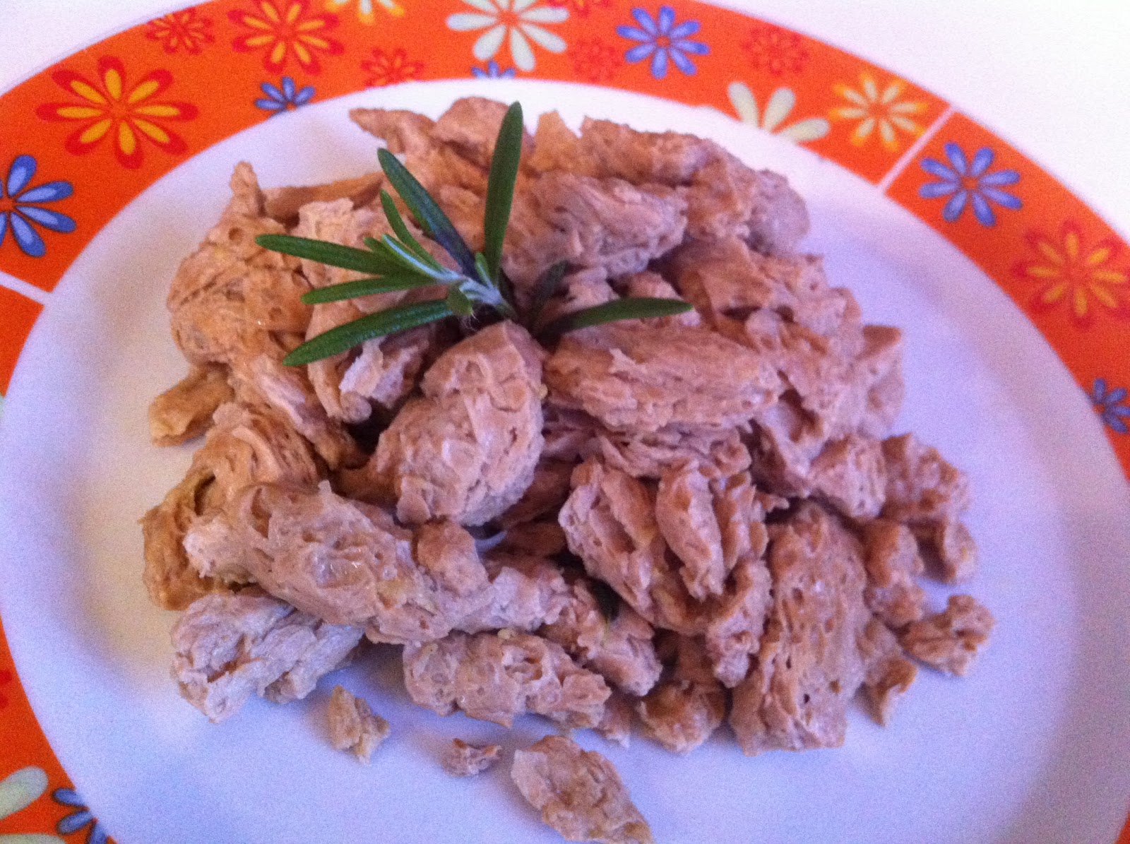 Prima di tutto reidratare la soia. In una ciotola capiente mettere i bocconcini, 1 cucchiaio di brodo insieme ad 1 cucchiaio di tamari, coprire con abbondante acqua bollente e lasciare coperto per almeno un paio d'ore.