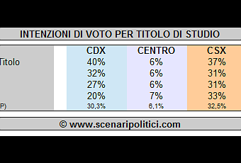Quinto ed ultimo round coi disaggregati per categorie. E’ il turno delle Intenzioni di Voto per Titolo di Studio. Qui le intenzioni di voto nazionali.