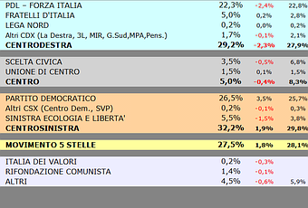 Censiamo questa volta il sorpasso del CSX sul CDX. Il CSX cresce e supera il 32%, il CDX al contrario scende sotto il 30%. Male il Centro, in calo. M5S in forte crescita in avvicinamento al CDX.