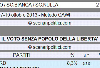Ad ottobre gli elettori PDL si sarebbero redistribuiti al 65% in altri partiti di CDX. 1 elettore su 3 avrebbe guardato altrove, chi verso il centro (3%), chi verso il M5S (4%),la maggior parte di questo sottoinsieme avrebbe rinunciato al voto (21%).