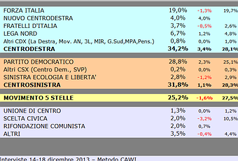 Forza Italia e Nuovo Centrodestra, se sommate (23%), ottengono un risultato nettamente migliore di quanto ottenuto dal PDL nel precedente sondaggo di ottobre (20,3%).