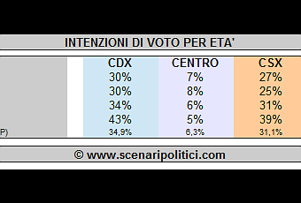 CDX e CSX ottengono risultati analoghi, risultano sempre più forti tanto più alta è l’età dell’elettorato. Il M5S è in testa tra gli under 30 e, pari col CDX, nella fascia 30-44. Sopra i 45 anni i risultati del M5S decadono, fino a scendere poco sopra il 10% negli over 60.