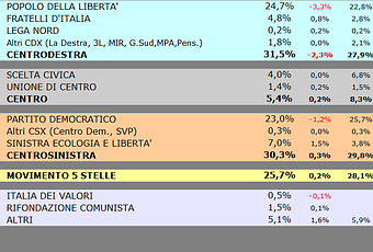 In caso di elezioni non pensiamo a stravolgimenti, il CDX potrebbe avere un lievissimo vantaggio sul CSX, con il M5S ad inseguire 5-6 punti dietro. Rispetto al rilevamento precedente il PDL frena prepotentemente ed il M5S torna ad essere primo partito. In consolidamento FdI e SEL. Cala il PD.