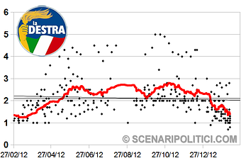 La Destra: dopo aver tenuto per mesi livelli anche superiori al 2%, La Destra ha subito un calo molto consistente dovuto alla ripresa del PDL e alla moltiplicazione delle liste all’interno del Centrodestra.